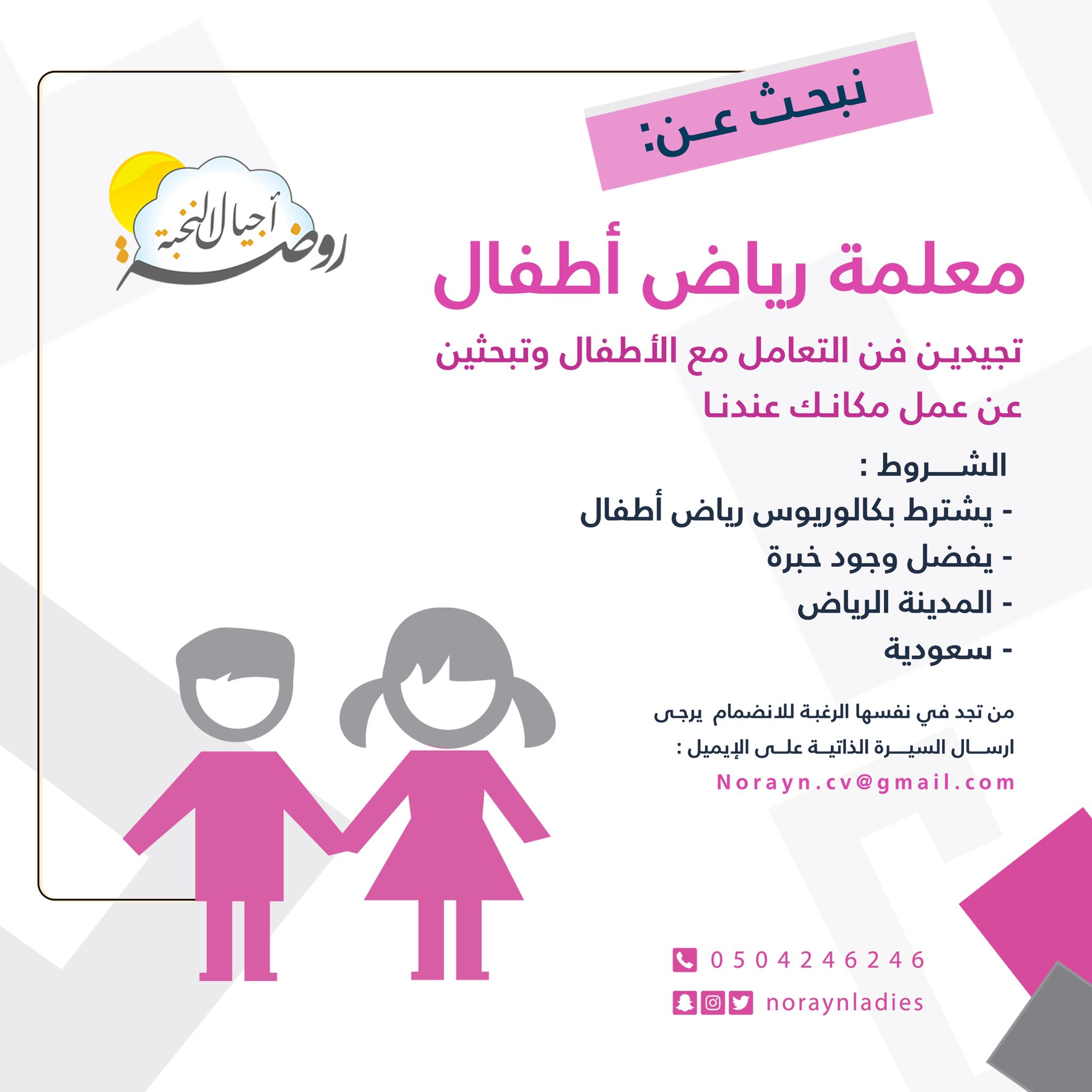 مجمع نورين النسائي On Twitter شاغر وظيفي بمسمى معلمة رياض أطفال في مجمع نورين النسائي للتقديم من خلال ارسال السيرة الذاتية على الإيميل Norayn Cv Gmail Com Https T Co Cqexdcuxfz